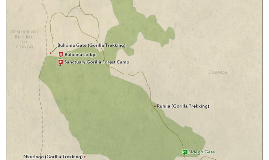 On the map, Buhoma is marked by well-defined access roads, clear trail networks, and a concentration of lodges near the park boundary.